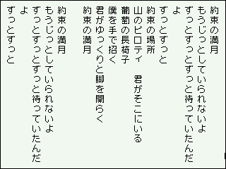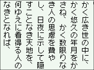 フォントは12ドットのフォントで、16文字×7行固定。選択キーを押すと、一行重なっての一ページスクロール、矢印下キーでは行単位スクロールです。