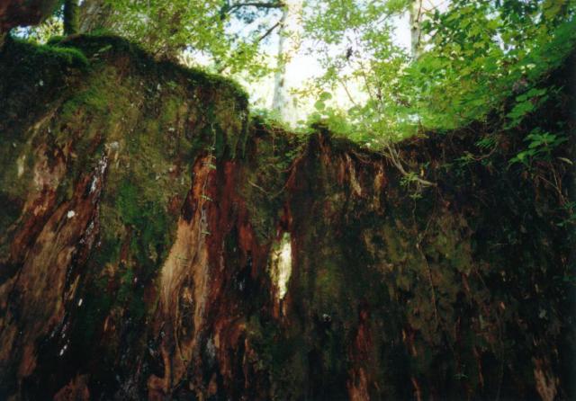 ここで初めて山小屋に泊まっていて朝小屋から下りて来たカップルとすれちがいます。あいさつをかわし、ウィルソン株の中に入ってお参りします。なかは完全に空洞で、天井はなく、見上げると空が見えます。寮の部屋など問題にならない位の広さです。ウィルソン株の内側にも、こけが付きかけています。一帯は湿地帯になっていて、と言うより一面あちこちに清烈な清水がとどまることなく流れています。水はとても綺麗です。