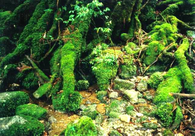 この辻峠から白谷雲水峡までの間の景色が、今日一日で一番気に入りました。緑の苔に覆われ、巨木の切り株・倒木跡に二代目の杉が育ち、美しい澄んだ水が流れます。