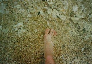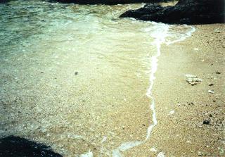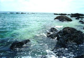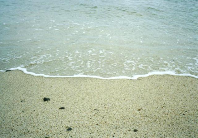 海岸を散策します。真っ白な砂浜に入ると、すべて珊瑚の殻で白くなっていることが分かります。岩場でカニを追いかけたりしながら、次のバスに乗るか、海で一日過ごすか迷います。