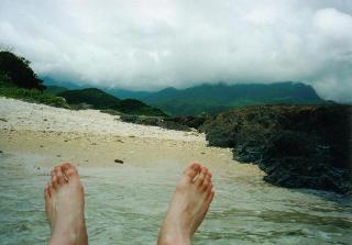 軽く泳いだ後、荷物に戻ってコンタックスT3を持ちだします。波しぶきをあびても使えるか耐久試験です。波間に見える屋久島の山は、山頂付近が雲に覆われています。きっと雨なんだろうなあ。