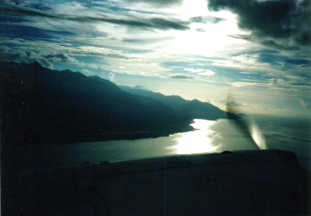 YS-11のプロペラの向こうに、太陽が屋久島に落ちようとしています。鹿児島までは離陸後わずか30分、あっという間です。